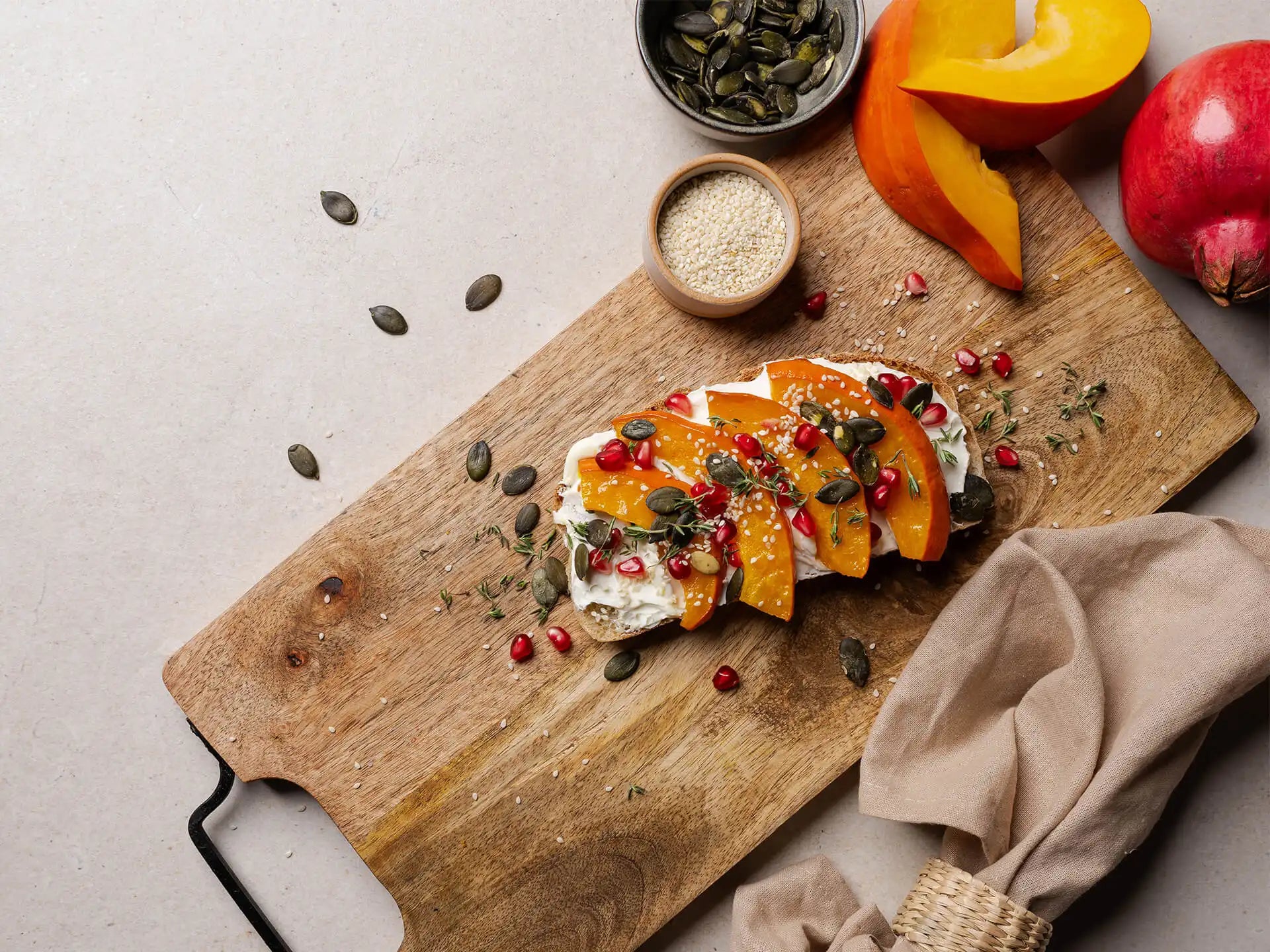 Kürbiskernen, Sesamsamen und Thymian getoppt.