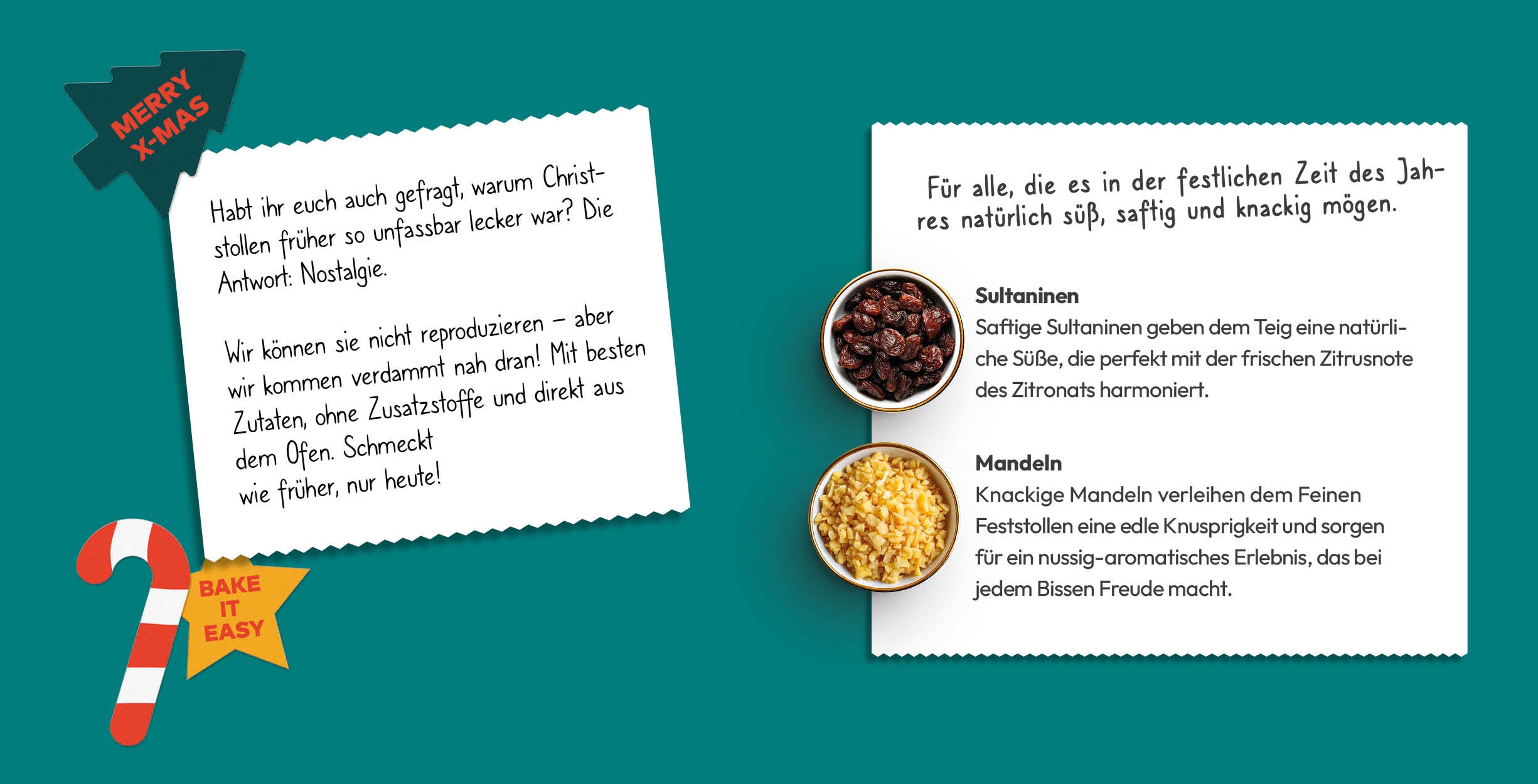 ✅ Deutschlands einzige Christstollen-Backmischung mit allen wichtigen Zutaten:  Sultanine, Mandeln, Zitronat & Puderzucker
